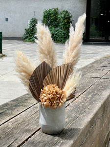 Luxusní aranžmá, které spojuje nadýchanou hortensii, pampasovou trávu a exotické palmové listy. Moderní, elegantní a stylová dekorace, která okamžitě dodá vašemu interiéru šmrnc a originalitu. Perfektní volba pro obývací pokoj, kancelář, hotel či jako jedinečný dárek.